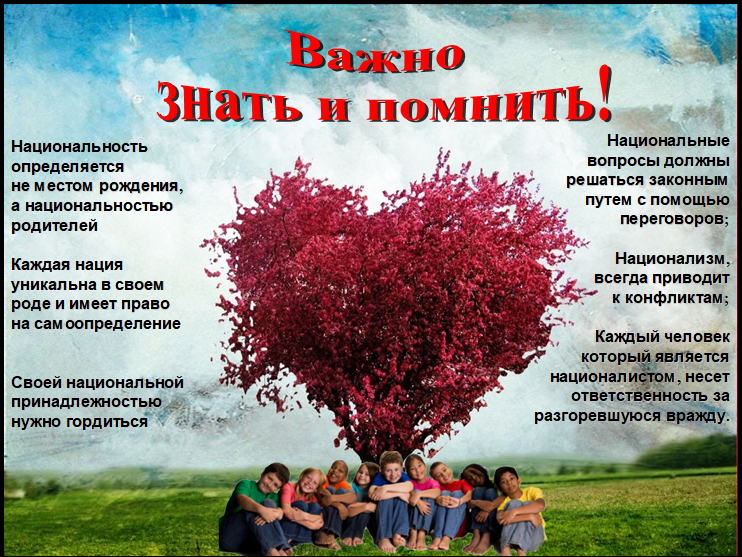 У каждого народа свои народные традиции. Но это не делает один народ хуже или лучше другого, наоборот, культура разных народов делает богатой и разнообразной культуру России.Важно помнить!• Национальность определяется не местом рождения, а национальностью родителей• Каждая нация уникальна в своем роде и имеет право на самоопределение• Своей национальной принадлежностью нужно гордиться• Национальные вопросы должны решаться законным путем с помощью переговоров;• Национализм, ни разу не привел к улучшению жизни граждан, а почти всегда приводил к конфликтам;• Каждый человек в отдельности, который является националистом, несет ответственность за разгоревшуюся вражду.Каждый народ по капле вносит свой вклад в сокровищницу культуры и истории нашего государства. У каждого народа свои песни, сказки, национальные костюмы. Но у всех у нас одна Родина – Россия.Я русский,.. татарин…калмык иль еврейМне нету на свете Отчизны милей!Моя ты Россия! Моя сторона!Любимая с детства!Где ты , там и я!(Источник: https://infourok.ru/urokscenariy-v-edinstve-nasha-sila-987058.html)