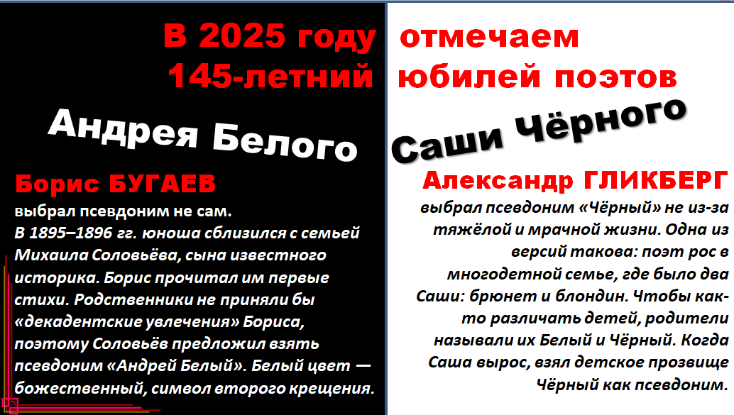 В 2025 году отмечается 145-летие со дня рождения Андрея Белого и Саши Черного. Андрей Белый родился 26 октября 1880 года, а Саша Черный родился 3 октября 1880 года, оба поэта-современники связаны с эпохой Серебряного века.
